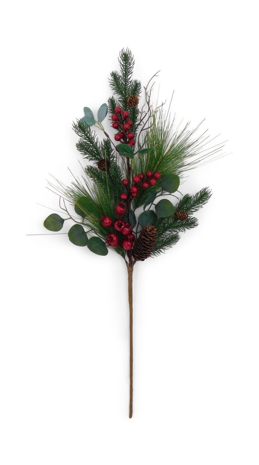 Add a touch of holiday season to your floral arrangment, wreath, or Christmas tree, with this 28" eucalyptus leaves, long pine needles and berry spray.