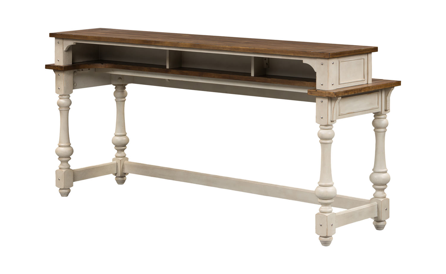 Style and function combine describe the Morgan XL Sofa Table with its dual purpose of creating an extra seating area behind a sofa and a place to serve your guests and entertain. Embrace the traditional design with a modern 2nd tier to give your living room that upscale cottage appeal. You'll love the two-tone superior finishes in antique white and tobacco medium brown.