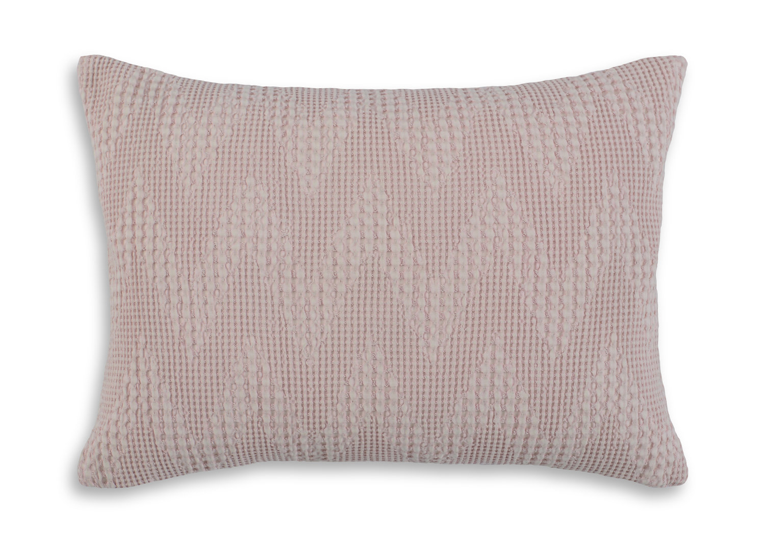 Be trend forward with the addition of the Fabiana Pink Pillow. This millennial pink decorative pillow is made with a woven fabric that has a subtle tone on tone pattern of a wide chevron. The pillow is filled with a down insert so that the pillow always looks fluffy and full. The feminine pink color will add a softness to any room where you add this decorative accessory. This pillow would look great on the top of the bed for a decorative pop in front of your standard sham pillows. The soft pink will add just the right amount of color to a neutral space.