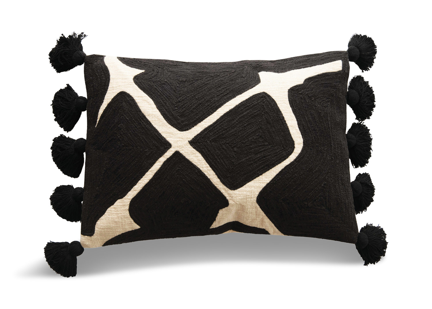 Black and white patterned the Modern Lumbar Pillow has five fun, fringed tassels on each end. A great way to place a pop of color on any upholstered piece, this modernly inspired pillow is a 'gotta have" for the home, with its cotton composition.