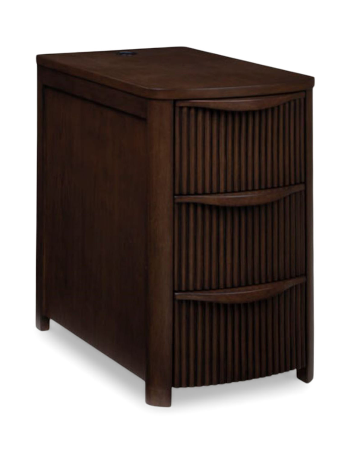 Introducing the Arnold Chairside Table by HOM Furniture, a modern marvel that combines style and functionality seamlessly. With reeded detailing and made with durable hardwood solids, this table exudes quality craftsmanship. The three curved front drawers not only add visual interest but also provide ample storage space. Stay connected with the built-in USB charging ports, making it easy to keep your devices powered up. The integrated drawer handles give a sleek and seamless look to the piece. The Arnold Chairside Table is versatile and will complement any décor.