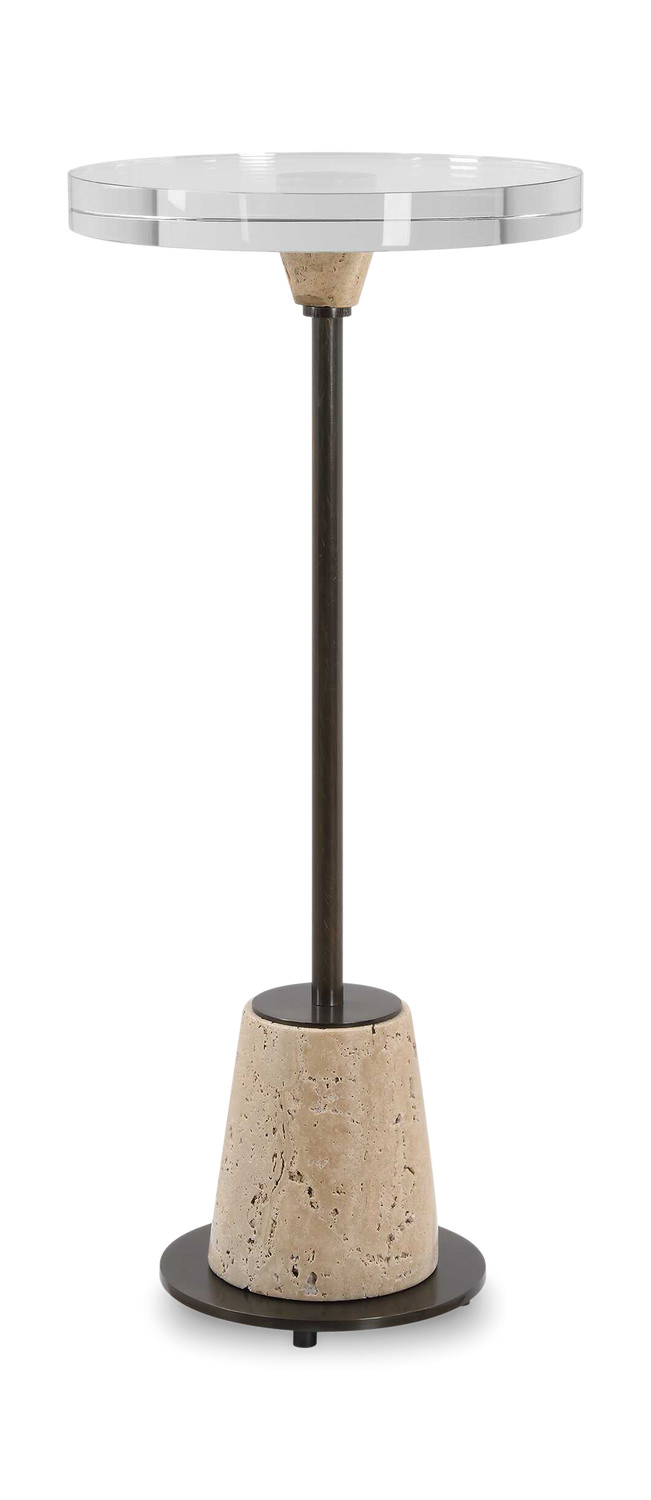 - The Arthur Accent Table Features A Thick Crystal Top, Honed And Unfilled Travertine, Paired With Bronze Finished Iron. The Fusion Of These Elements Has Given This Table An Organic And Sophisticated Aesthetic Ready To Enhance Any Room.