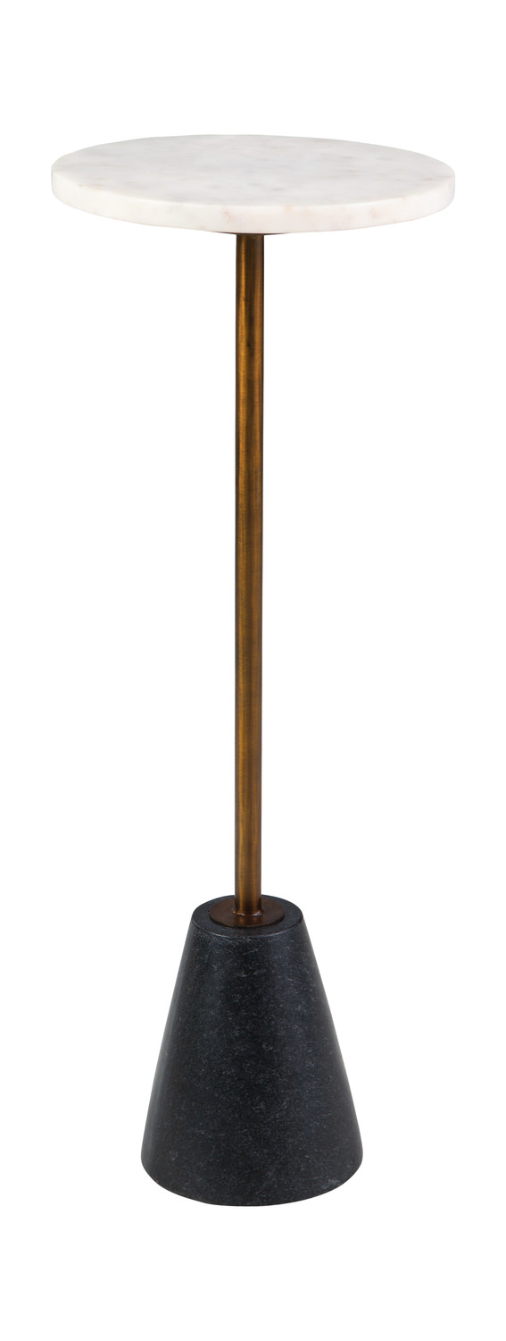 Introducing the Cara Accent Table from HOM Furniture, a stunning piece that combines practicality with style. This end table features clean lines and a sleek design, with a black marble conical base and a gold metal upright post adding a touch of elegance to any room. The round white marble top is both beautiful and durable, showcasing possible natural fissures, mineral deposits, and veining that make each piece unique. While it requires assembly, the end result is a chic and sophisticated addition to your home decor. With the array of styles and great decorative touches available in the accent assortment, the Cara Accent Table is the perfect choice for adding a touch of luxury to your living environment.