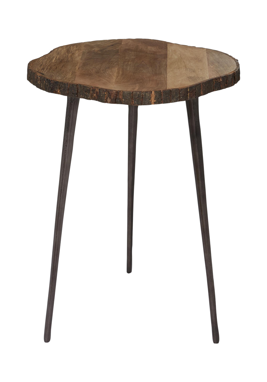 Introducing the Cassian Accent Table by HOM Furniture, a stunning piece that combines the natural beauty of mango tree wood with the strength of aluminum. This accent table is a true embodiment of durability and robustness, making it a perfect addition to your home. The unique tree trunk tabletop paired with tapered metal tripod legs adds a touch of rustic charm to any space. Embrace the beauty of nature in your home with the Cassian Accent Table.