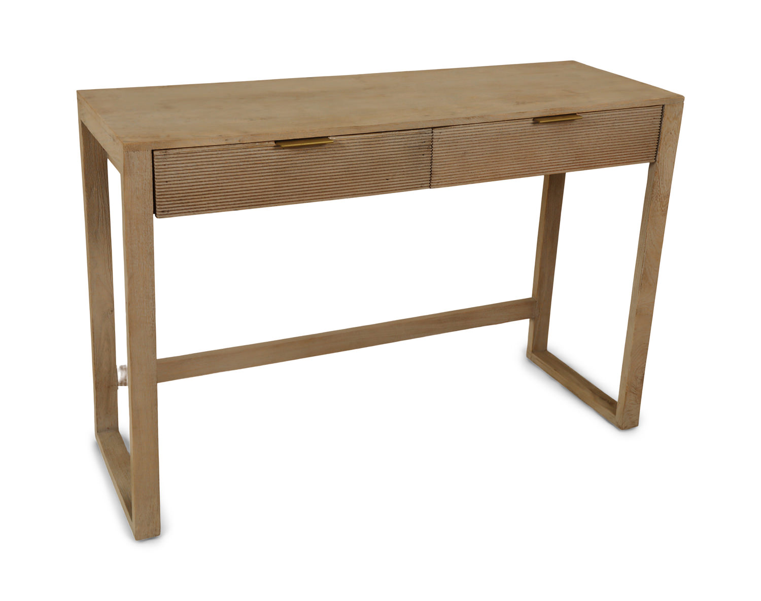 The Dario Console Table is a special piece that could have many different functions in your home. This table is made from solid Mango wood and finished in a warm natural finish. There are two drawers that have a linear fluted design carved into the face with a sleek dark handle. The U shape legs add a modern element with a geometric flare. Use this table in your living room and tuck 2 stools underneath for extra storage. Or use this as a small laptop desk in your bedroom.