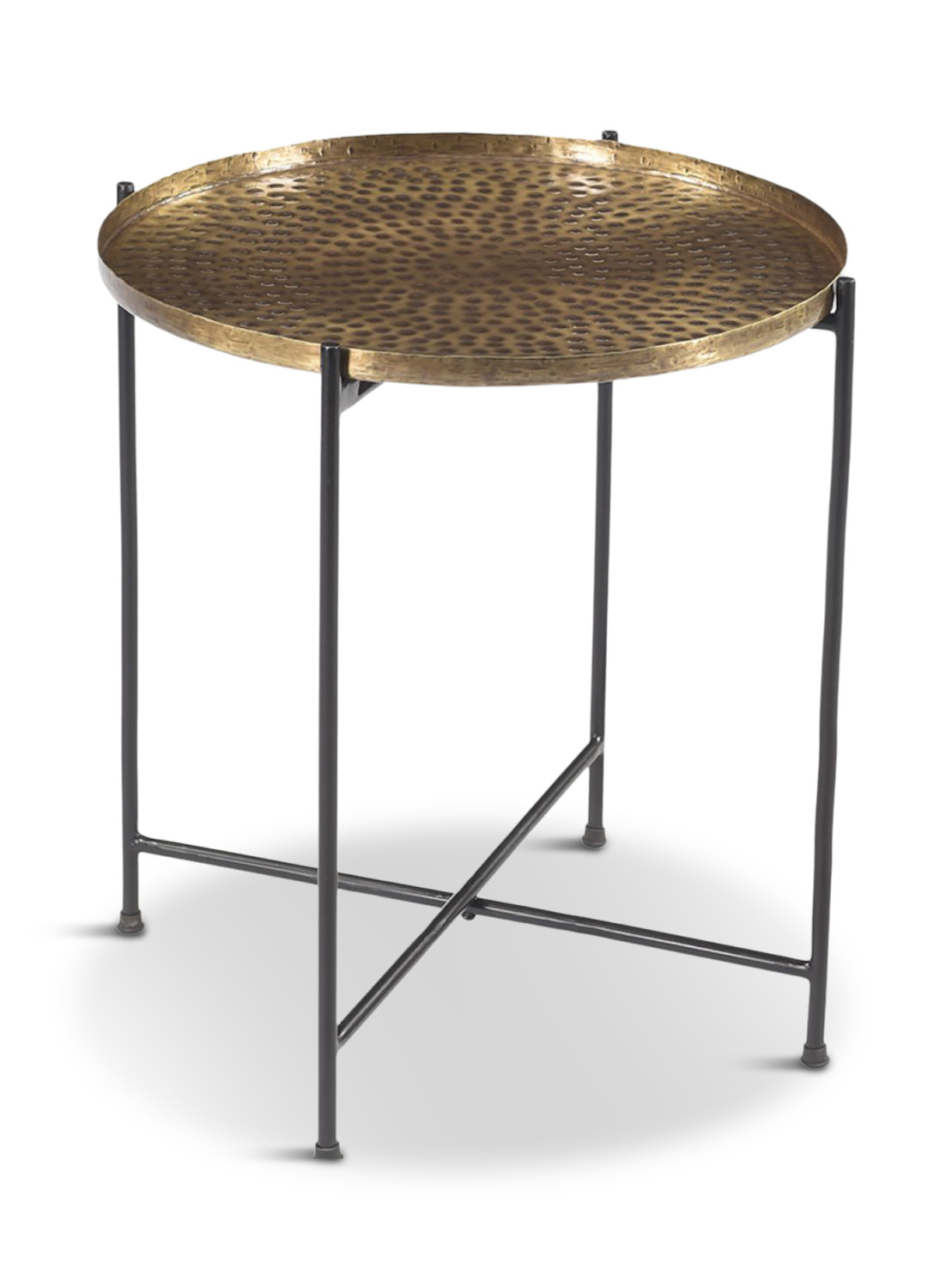 Introducing the Farley Accent Table, the perfect addition to your living space. The black metal frame provides a sturdy and stylish base for the brass-finished metal top. The hammered finish on top adds texture and depth to the table, creating an eye-catching piece that is sure to impress. This accent table is not only beautiful but also functional, providing a convenient surface for your drinks, books, or other decorative items.