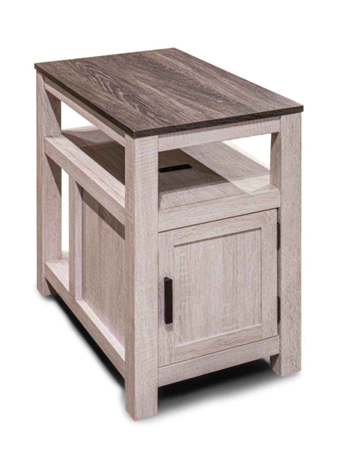 Introducing the Flinn Chairside Table by HOM Furniture, exuding timeless charm. Perfect for your living room or bedroom, this table features one open display shelf for showcasing your favorite décor pieces and one storage cabinet to keep your essentials neatly organized. With built-in USB charging ports, you can easily charge your devices while relaxing. Embrace the rustic style and keep your entertainment essentials close by, utilizing the cabinet space. Upgrade your space with the Flinn Chairside Table for a perfect blend of style and functionality.