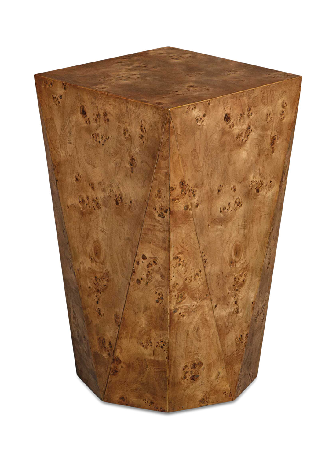 - This Accent Table Showcases A Captivating Geometric Design With Angled, Faceted Sides That Beautifully Accentuate The Rich Patterns And Intricate Grain Of The Caramel Finished Poplar Burl Wood. Its Striking Form Creates A Stunning Focal Point, Making It A Perfect Centerpiece For Any Space.