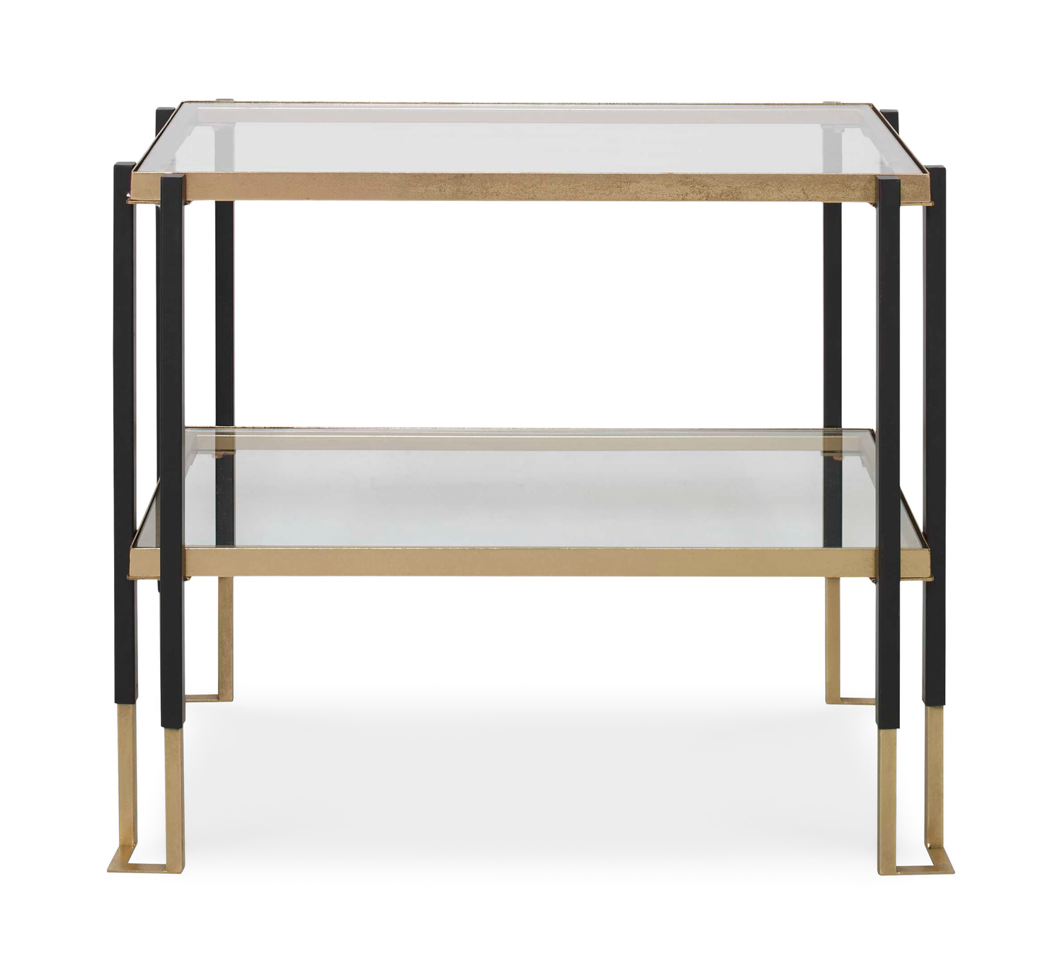 - Featuring A Clean Lined Solid Iron Frame, This Contemporary Table Is Finished In A Two-toned Matte Black And Gold Leaf. Has Two Tempered Glass Shelves.