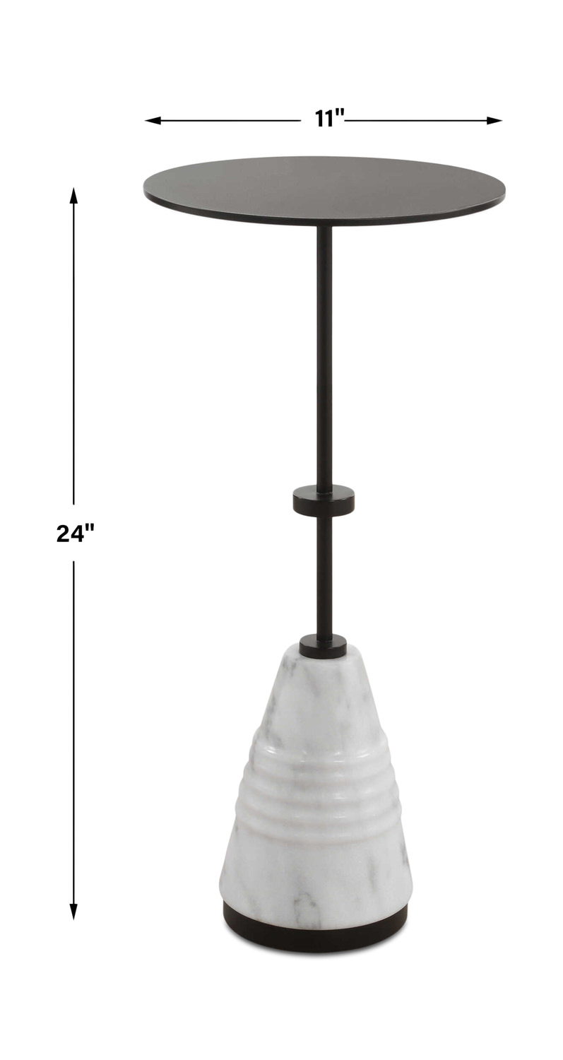 Add a touch of sophistication to your space with the Kincaid Metal Drink Table from HOM Furniture. Crafted by Uttermost, this elegant table features a black metal top paired with a beautifully carved marble base, creating a striking contrast that exudes strength and artisanal charm. The unique variations in the natural stone ensure that each piece is one-of-a-kind. Ideal for adding a touch of elegance to any room, this accent table is a perfect blend of durability and style.