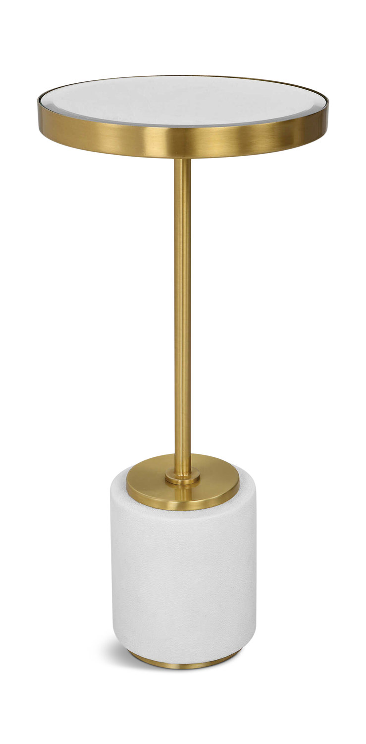 - Stylish And Sophisticated, This Round Accent Table Features A Fresh White Faux Shagreen Base Paired With An Iron Support In Rich Brushed Brass And A Beveled Mirror Top.