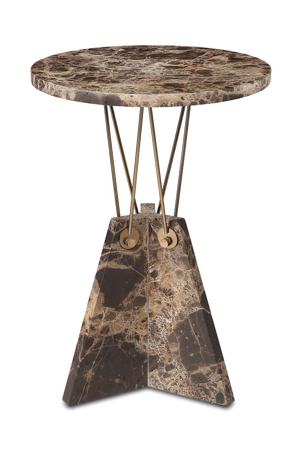 - This Geometric Table Features A Round Top And Base Made Of Rich Emperador Brown Marble Connected By Iron Rods Finished In Brass With Knurled Knob Accents. Due To The Nature Of Marble, Each Piece Will Have An Unique Coloration And Veining Pattern.