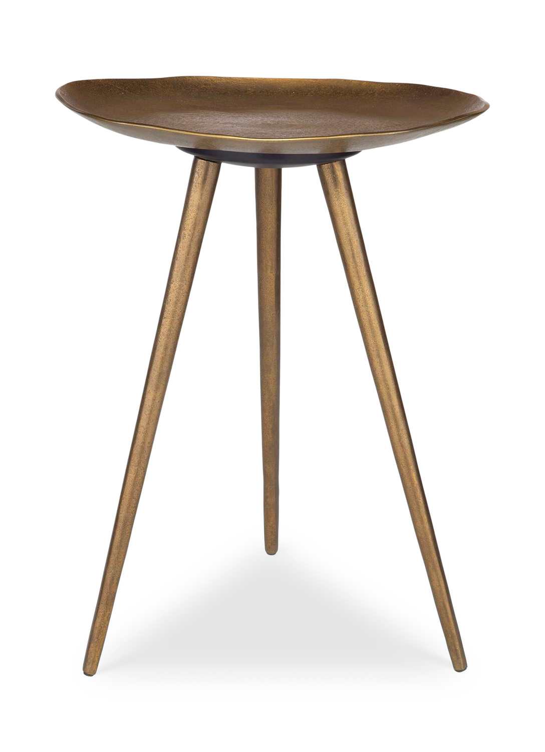 - This Unique Accent Table Is Made From Cast Aluminum In An Antique Brass Finish. The Three Slender Legs Extending Outward Give The Table Its Sturdy Tripod Base Supporting The Lily Pad Shape Top.