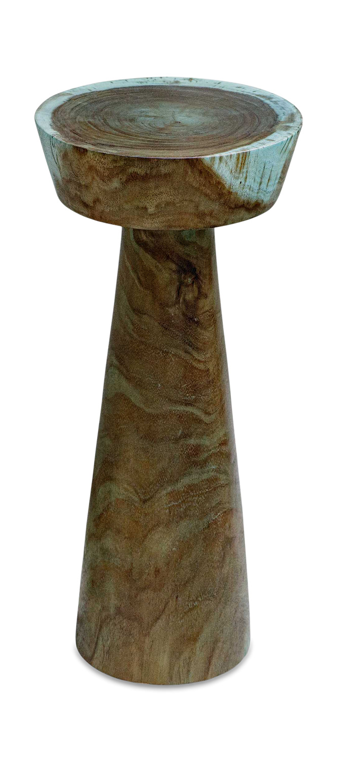 • Crafted From Solid Suar Wood, This Drink Table Features A Striking Blend Of Blue And Green Tones That Enhance Its Natural Grain And Organic Form. The Tabletop Sits Atop A Tapered Pedestal Base.