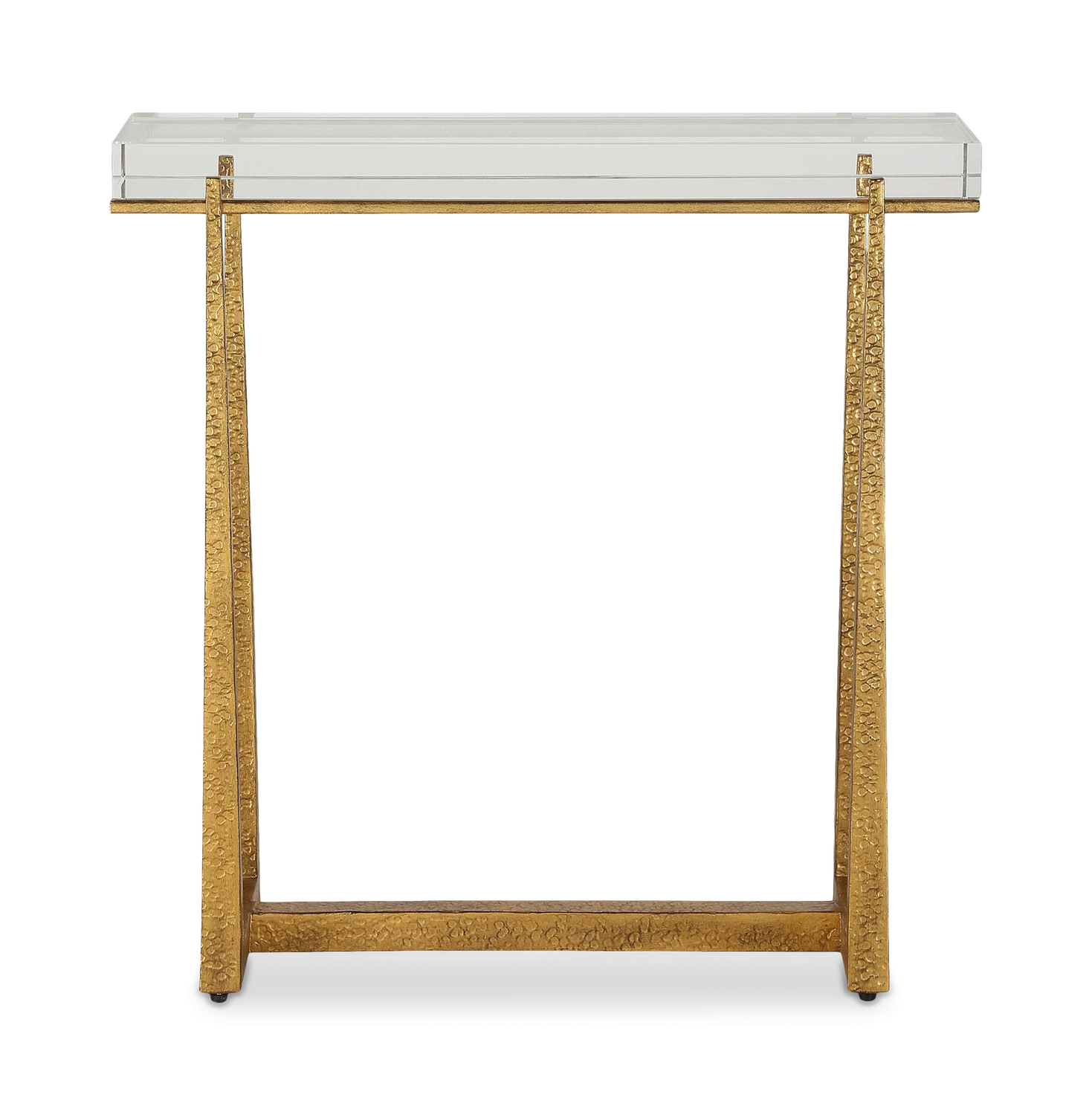 - This Elegant Accent Table Adds A Touch Of Luxury To Any Room. The Textured Antique Gold Finished Iron Legs Perfectly Support And Accentuate The Thick Rectangular Crystal Top.