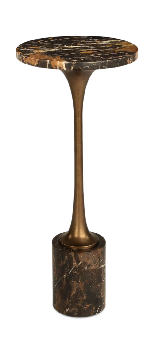Introducing the Reign Drink Table by HOM Furniture, where elegance meets sophistication. This exquisite accent table features a striking black marble tabletop, complemented by a matching cylindrical foot, creating a cohesive and opulent design. Each piece is unique, showcasing intricate veining patterns that add a touch of individuality to your space.