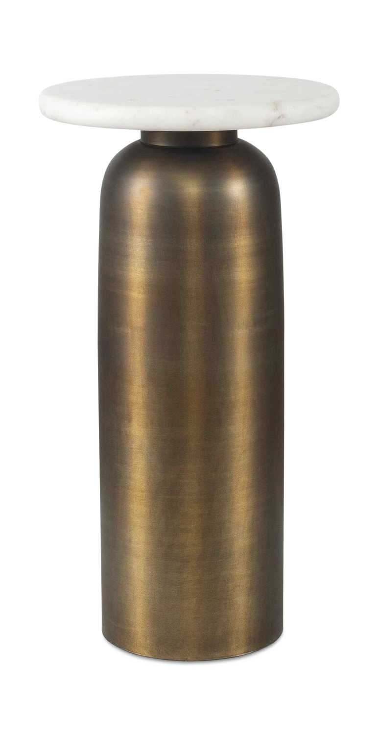 • This Striking Contemporary Drink Table Presents An Elegant Interplay Of Materials, Where A Sleek Antique Brass Aluminum Base Provides A Warm Counterpoint To The Cool Sophistication Of A Naturally Veined White Marble Top. True To The Nature Of Natural Materials, Each Piece Will Have Unique Marbling And Veining Throughout.