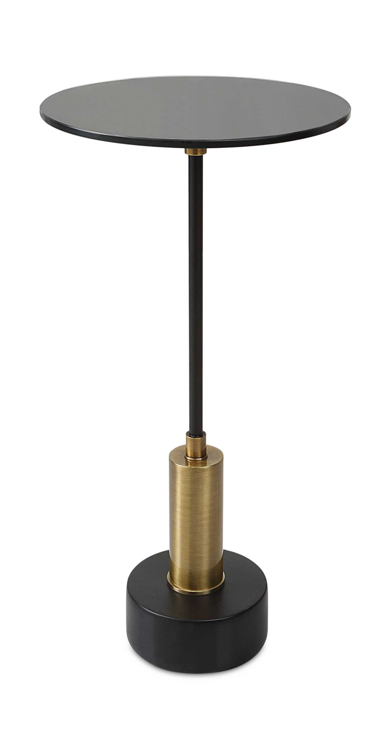 - Elegant And Sophisticated, This Round Accent Table Features A Brushed Brass And Satin Black Iron Base With Black Marble Details And A Black Glass Top.