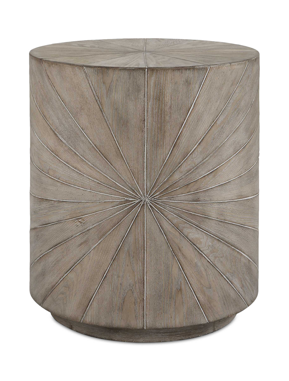 - Crafted From Fir Wood Veneer, The Starshine Side Table Features A Starburst Motif Surround Finished In Warm Gray Stain With Light Cerusing That Accentuates The Natural Wood Grain.