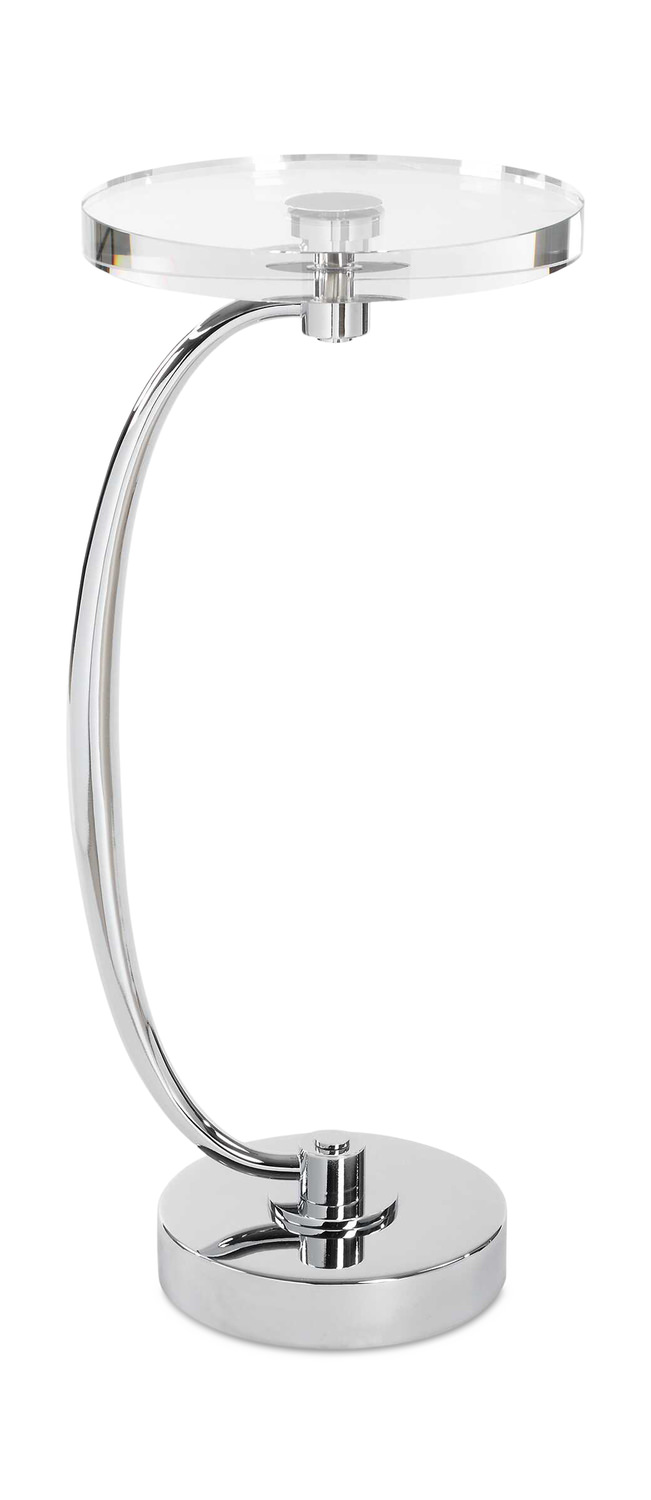 Enhance your living space with the exquisite Waveney Drink Table from HOM Furniture. Crafted with precision, this stunning piece features a sleek curved base in polished nickel plated iron, exuding a sense of minimalistic elegance. The thick crystal top adds a touch of sophistication, making it a perfect addition to any modern decor. Designed by Uttermost, this accent table in a radiant nickel color is sure to elevate your home aesthetic. Add a touch of luxury and style to your space with the Waveney Drink Table.