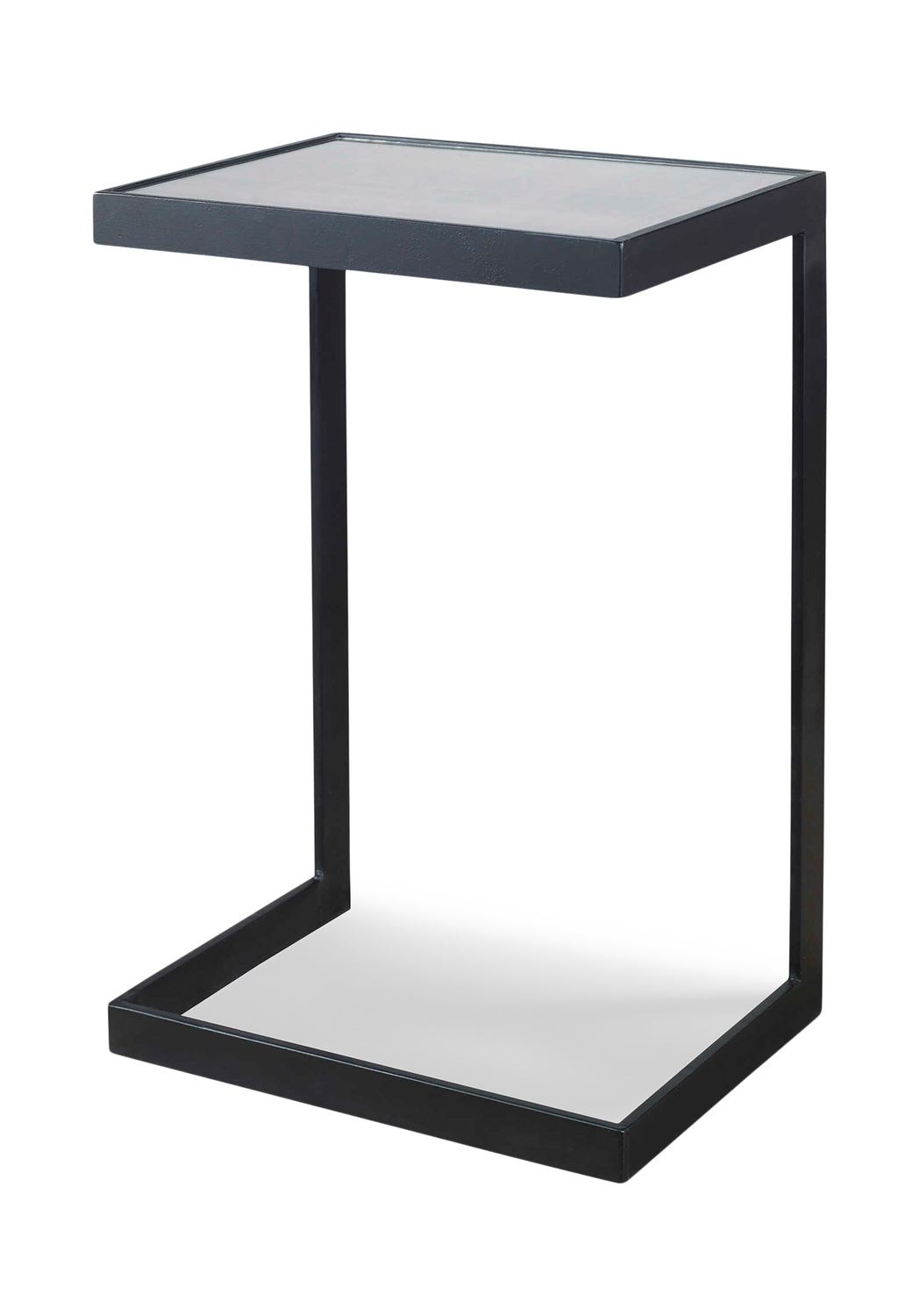 - A Simplistic Cantilever Design With Classic Style, Features Thick Aged Black Iron With An Open Framed Base, And A Mirrored Top With Linear Antiquing And Distressed Edges.