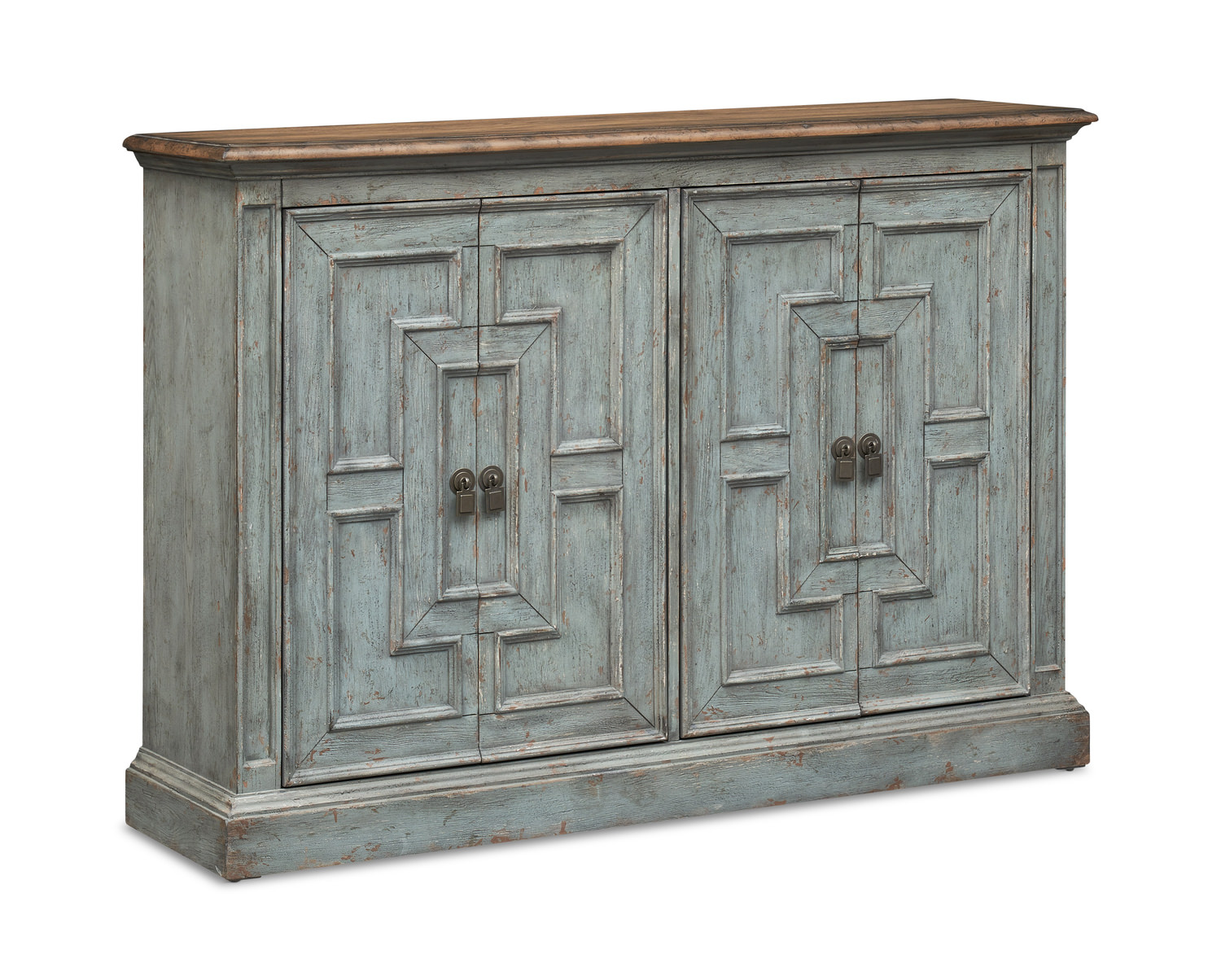A contrasting, wood-finished top with a medium blue/grey finished cabinet, the Four Square Credenza will make a beautiful addition to any home. Four doors, provide for plenty of concealed storage. The decorative doors are framed around the center with decorative, drop hardware in a pewter-like finish. Let the beauty of this piece bring enjoyment to your home environment.