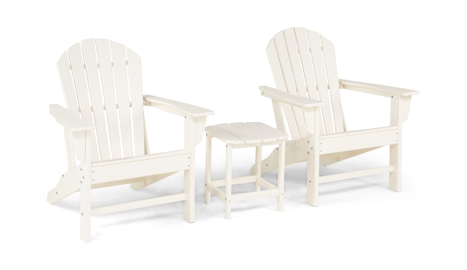 Crafted from high density polyethylene, the Sunset II 3 Piece Adirondack Set features durable, yet beautiful stainless steel hardware. This adirondack set includes two slatted chair designs with a sturdy framework that provides exceptional stability and one end table. Custom orders not available.