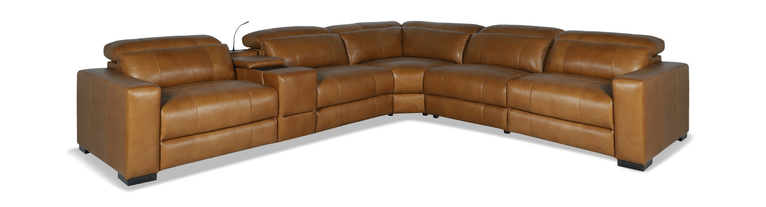 Introducing the epitome of luxury and convenience, the Brandi 6 Piece Leather Power Modular Sectional by HOM Furniture. Crafted with precision and sophistication, this sectional is the perfect blend of style and functionality. Sink into the wide, deep seating filled with plush 2.0 density foam, providing unparalleled comfort and support for hours of lounging. The lumbar recline feature allows you to adjust your seating position effortlessly, while the power headrest ensures optimal neck and head support. Made from 100% genuine leather, the sectional exudes opulence and durability.