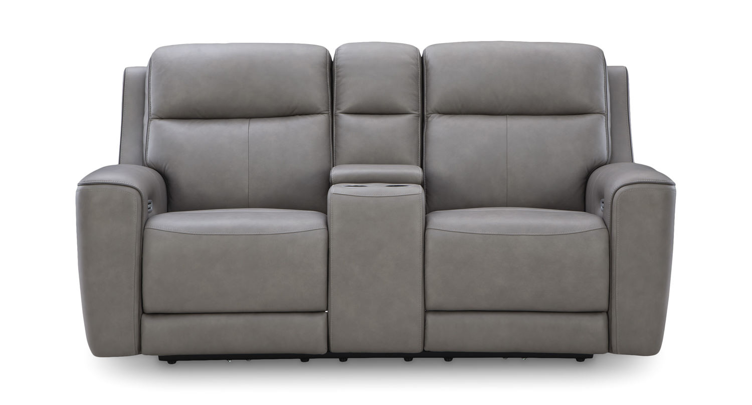 Introducing the Campbell Leather Power Reclining Loveseat with console from HOM Furniture, the perfect blend of comfort and style for your living space. This modern piece features a drop-down table, power headrest, lumbar and heat functions, and a 4-zone massage system for ultimate relaxation. With a heavy-duty recline mechanism, this loveseat offers durability and long-lasting comfort. The taupe leather upholstery adds a touch of sophistication to any room, while the transitional design seamlessly fits into any decor.