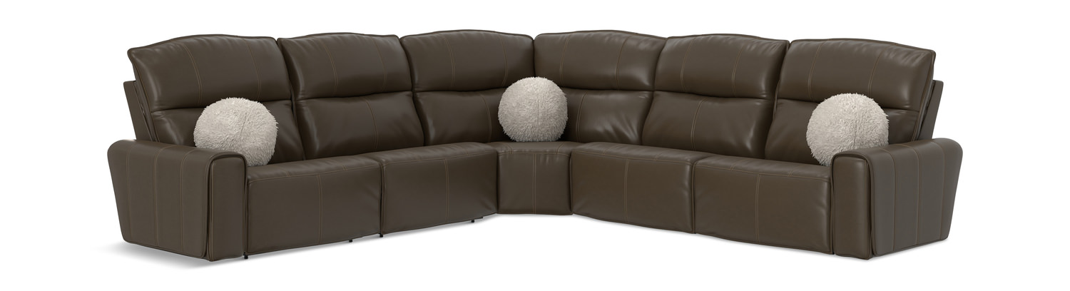 Introducing the Hudson 5 Piece Modular Sectional from HOM Furniture, where comfort meets style seamlessly. Crafted with the finest leather in all the right places, this sectional ensures a luxurious seating experience. The coil in cushion seating, enhanced with a Comfor-Gel memory foam topper, provides unparalleled support and relaxation. You'll love the attention to detail with decorative contrast luggage stitching and flange welt, adding a touch of sophistication to your space. The power headrest and recline features, along with the zero gravity recline option, offer customizable comfort at your fingertips.