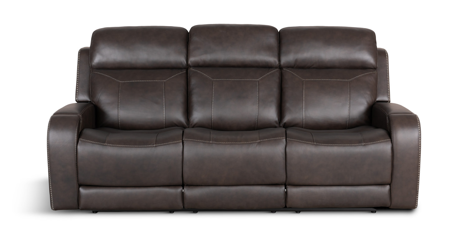 Introducing the Kona Leather Power Reclining Sofa from HOM Furniture, the perfect blend of comfort and style for your living room! Sink into luxurious relaxation with the power headrest and lumbar support, while enjoying an immersive sound system for the ultimate movie night experience. The heat and massage function in the end seats will help you unwind after a long day, while the zero gravity recline feature elevates your comfort to the next level. Crafted in rich brown leather and boasting a traditional yet casual style, this 87" sofa brings a touch of elegance to any space.