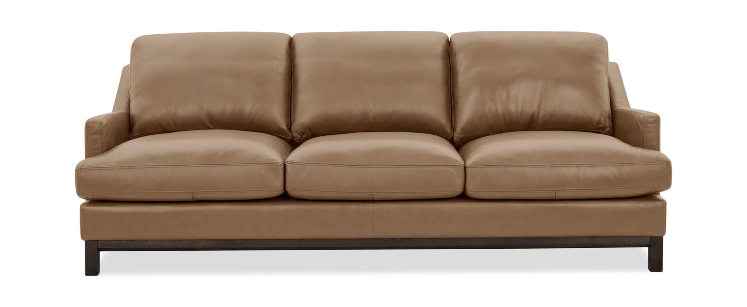 Indulge in the epitome of luxury with the Langley Leather Sofa from HOM Furniture. Crafted with the finest materials, this sofa boasts high-resiliency foam for unparalleled comfort and support. The transitional style seamlessly blends modern and traditional design elements, making it a timeless addition to any living space. Featuring 100% Top Grain leather on the seats and a vinyl match on the sides and back, the Langley Leather Sofa exudes sophistication in a beautiful butternut color. Its engineered hardwood frame and steel spring suspension ensure durability and longevity, while providing a sturdy foundation for relaxation.