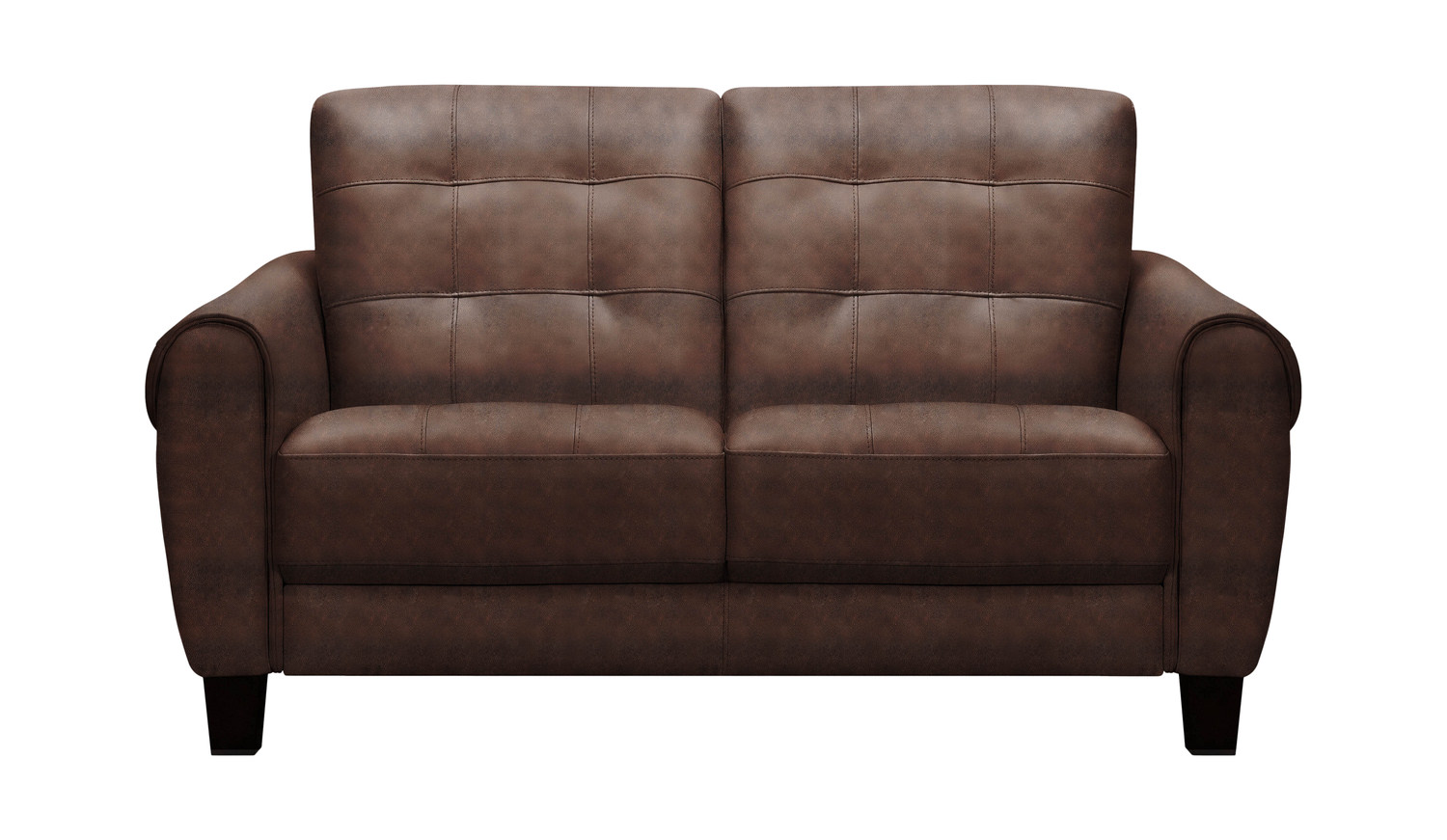 The HOM Furniture Madden Leather Loveseat is a stylish and comfortable addition to any home. It is made of 100% genuine leather and features 2.5 high-resiliency foam cushions for added comfort. The loveseat also has tufting on the back and seat cushions, unique saddle arms, and is scaled to fit in smaller condos. It is stocked in three colors and can be custom ordered from a variety of leather options.