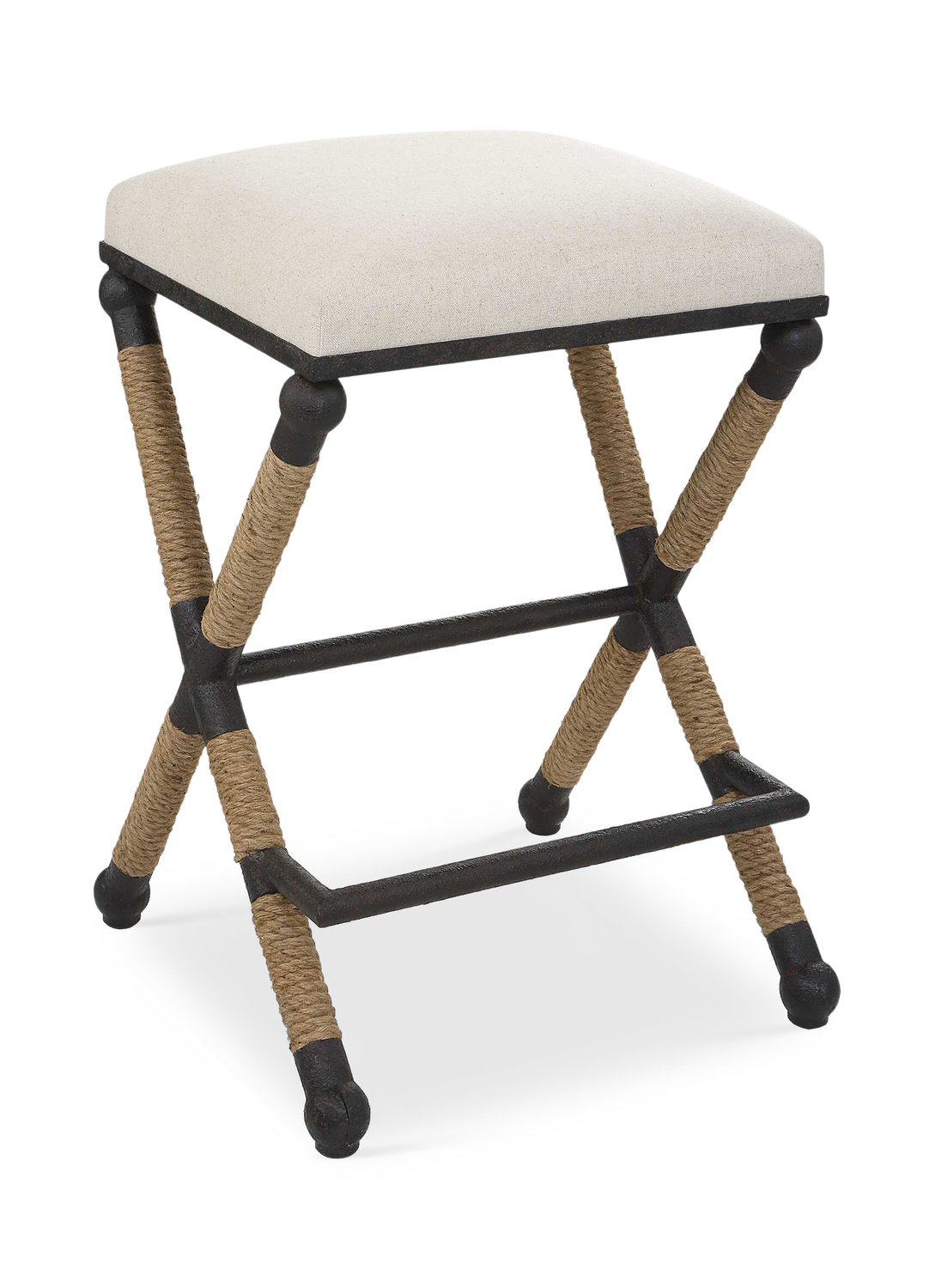 Upgrade your home decor with the Firth Rustic Oatmeal Counter Stool by Uttermost from HOM Furniture. This stylish piece features a rustic iron frame with a nautical touch, elegantly wrapped in natural fiber rope accents. The cushioned top is made of sturdy cotton in a neutral oatmeal color with a performance treatment for added durability. The sleek black color adds a modern flair to this timeless design. Elevate your space with this sophisticated and comfortable counter stool that seamlessly combines style and functionality.