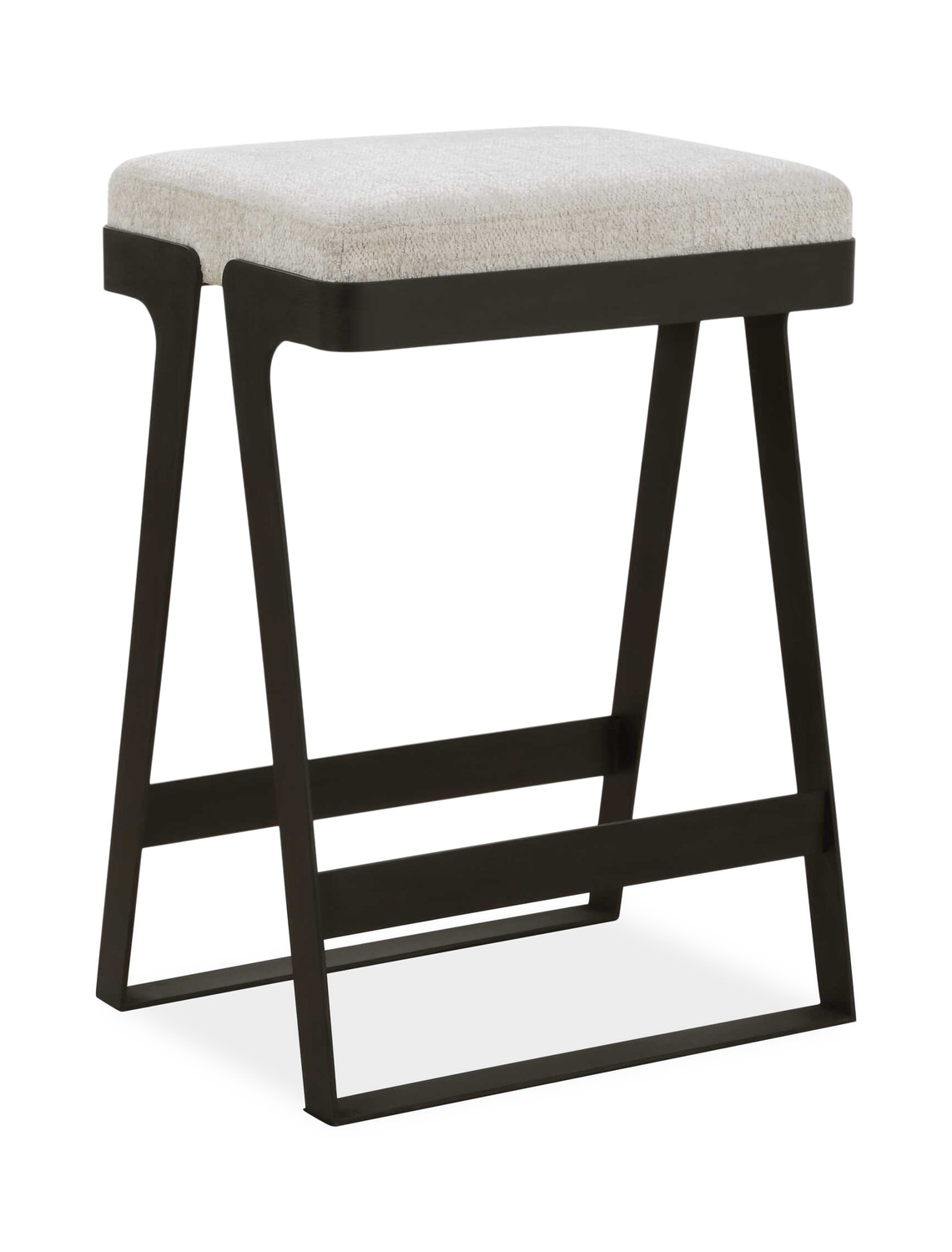 - The Modern Hover Counter Stool Is Streamlined With An Aged Black Curved Iron Base And Cushioned Seat. Upholstered In An Ivory Chenille Boucle Performance Fabric.