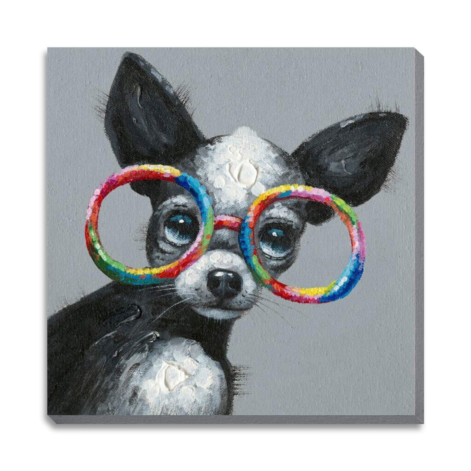 Add a charming piece of art to your home with the Argo Canvas Art. This piece measures 16" tall and 16" wide and features a black and white Chihuahua dog with rainbow colored round glasses. Argo's cute face is sure to bring a smile to your face everyday. The size is also great so you can create a gallery art wall display or use it on a bookcase.