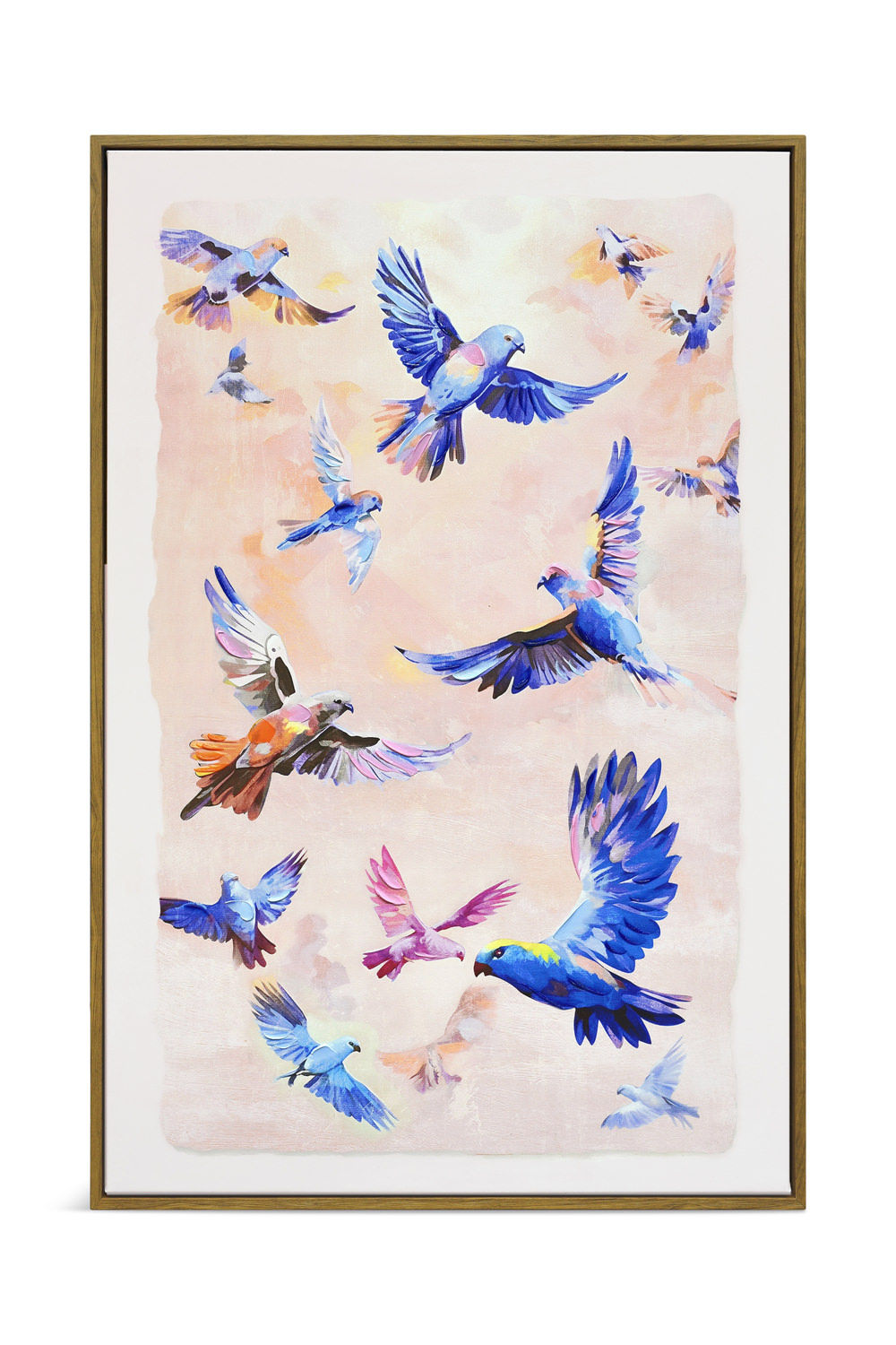 Introducing the Fluttering Parrots Framed Art by HOM Furniture, a vibrant and captivating piece that will add a burst of color and cheer to any space! This stunning artwork features a flock of parrots in flight against a mesmerizing pink sunset backdrop, set within a beautiful brown wooden frame for a touch of elegance. Each parrot showcases a unique coat color, creating a symphony of stunning colors that will surely brighten up your home. Bring the beauty and liveliness of nature indoors with this eye-catching piece that is sure to spark joy and conversation.