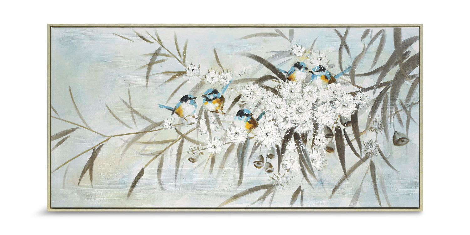 Introducing the charming Tittle-Tattle Framed Art by HOM Furniture! This delightful piece features a whimsical scene of a flock of birds perched together on branches, set against a vibrant, bright blue backdrop. The speckle of white flowers adds a touch of elegance and creates a beautiful disguise among the birds. Perfect for adding a pop of color and nature-inspired charm to any room in your home. Bring a touch of nature indoors with this captivating artwork!