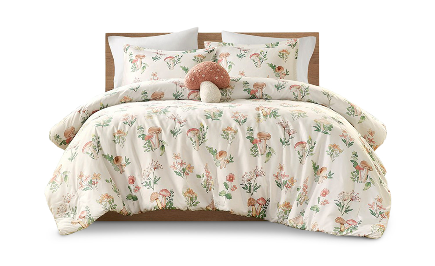 Introducing the Gwen Mushroom Bedding Set from HOM Furniture, where whimsy meets comfort! This charming bedding set is adorned with a delightful mushroom and floral pattern that will add a touch of magic to your bedroom décor. Available in two sizes; twin size includes 1 standard sham and full/queen includes 2 standard shams. This set includes a cozy comforter filled with hypoallergenic polyester for a restful night's sleep. The set also comes with an adorable accent pillow in the shape of a mushroom, adding a fun and playful element to your bedding ensemble. Plus, the entire set is machine washable for easy care and maintenance.