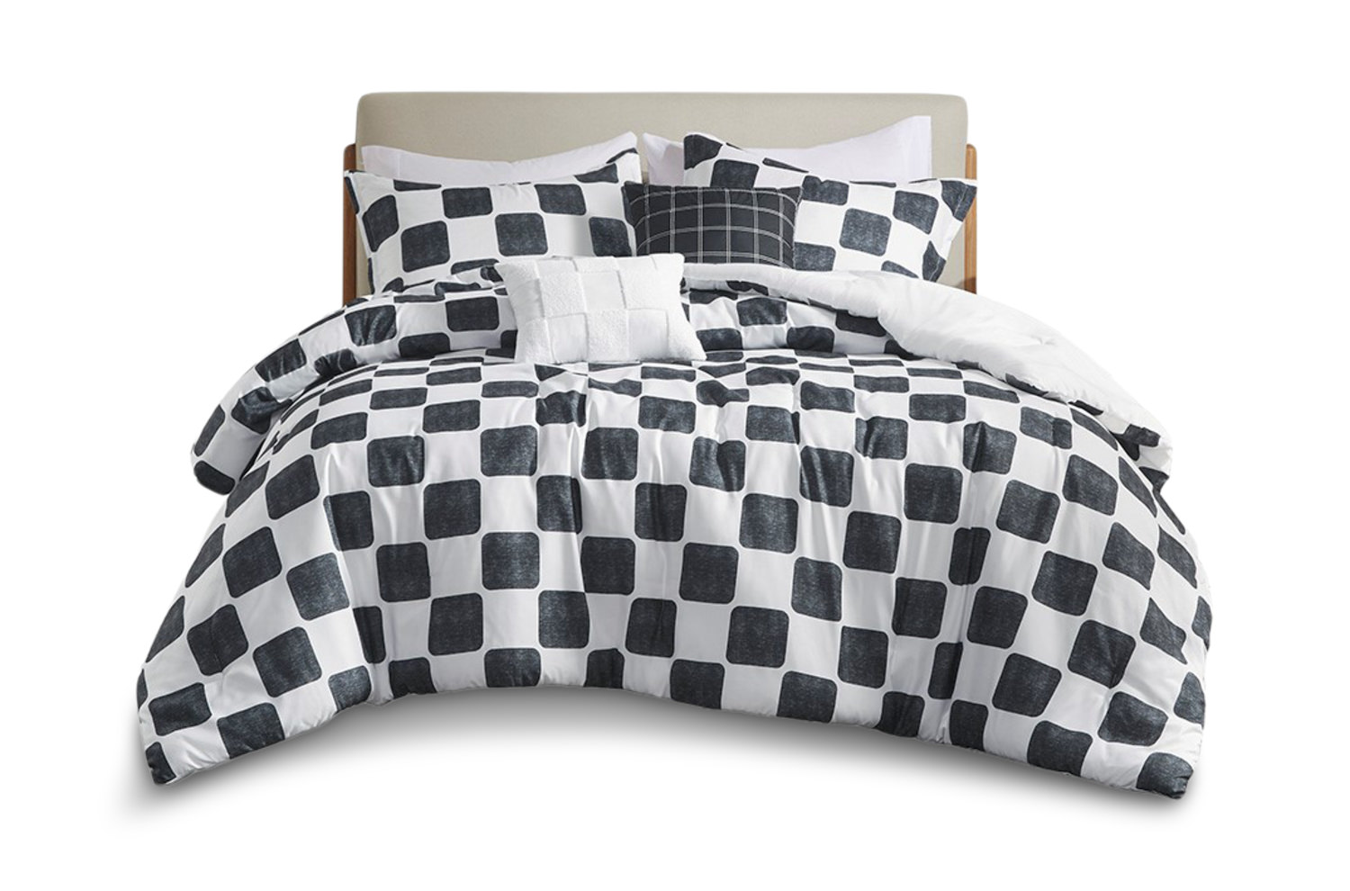 Introducing the stylish Miley Checkered Bedding Set from HOM Furniture! This modern set features a bold black and white checkered design that adds dimension and uniqueness to any bedroom décor. Available in two sizes; twin size includes 1 standard sham and full/queen includes 2 standard shams. Complete with two decorative pillows, this comforter set is both eye-catching and comfortable. This set is perfect for any bedroom. And for added convenience, the Miley Checkered Bedding Set is machine washable for ease of care. Elevate your bedroom with this chic and contemporary bedding set from HOM Furniture!