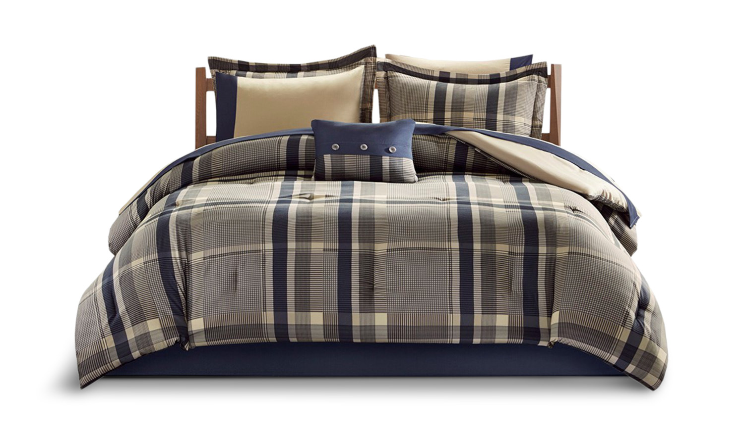 Introducing the Robbie Plaid Bedding Set from HOM Furniture, perfect for a cozy and stylish bedroom upgrade! This bedding set features a modern color palette of navy and taupe, adding a touch of sophistication to your space. Available in two sizes; twin size includes 1 standard sham and queen includes 2 standard shams. The complete sheet set includes a contrasting navy flange for a bold accent, while the included decorative pillow adds a chic finishing touch. With a bedskirt in navy included, this set offers everything you need for a fresh and inviting bedroom look. Upgrade your bedding with the Robbie Plaid Bedding Set and enjoy a casual, contemporary update to your décor!