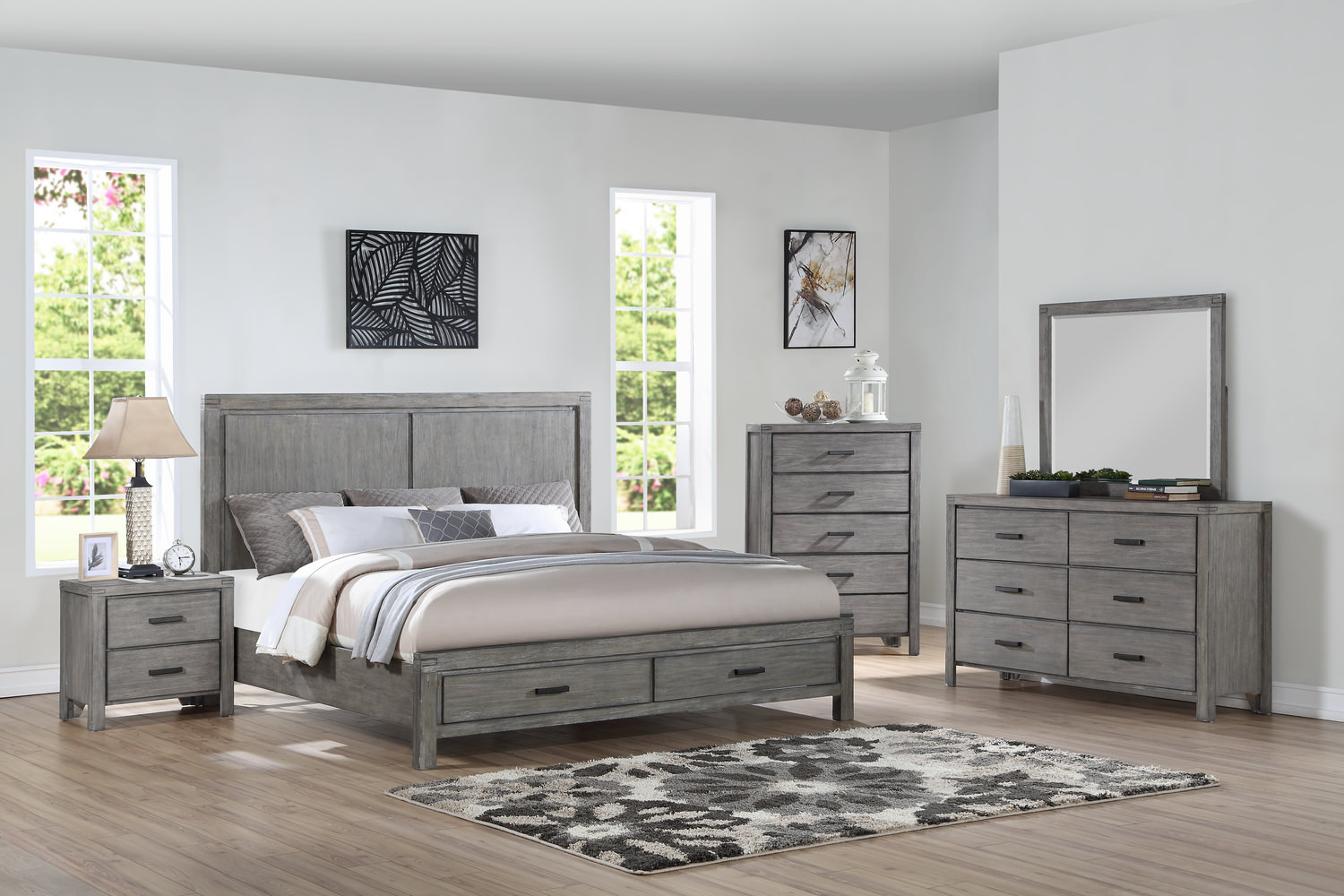The Flagstaff Bedroom Suite is constructed of acacia wood. A grey finish, on these wood solids and veneers with wire brush detailing, adds dimension to this exciting bedroom collection. An inviting look, the geometric feeling, and uncomplicated lines and design have a definite appeal. Clean and straightforward, it is a delight to behold, this bedroom group. The high headboard with low profile, storage footboard of the panel bed, makes a statement of its own. The suite includes a bed, dresser, mirror and nightstand. Their construction quality, includes French and English dovetail drawer joinery, with side mounted, (ball bearing) full extension drawer glides. Both practical and functional, they provide durability and operate dependably. A horizontal, bar handle in antique black, accents the center of the drawer exterior. Simply beautiful, the Flagstaff Bedroom Suite, is a splendid solution for any one of your home's bedroom spaces. Chest sold separately.