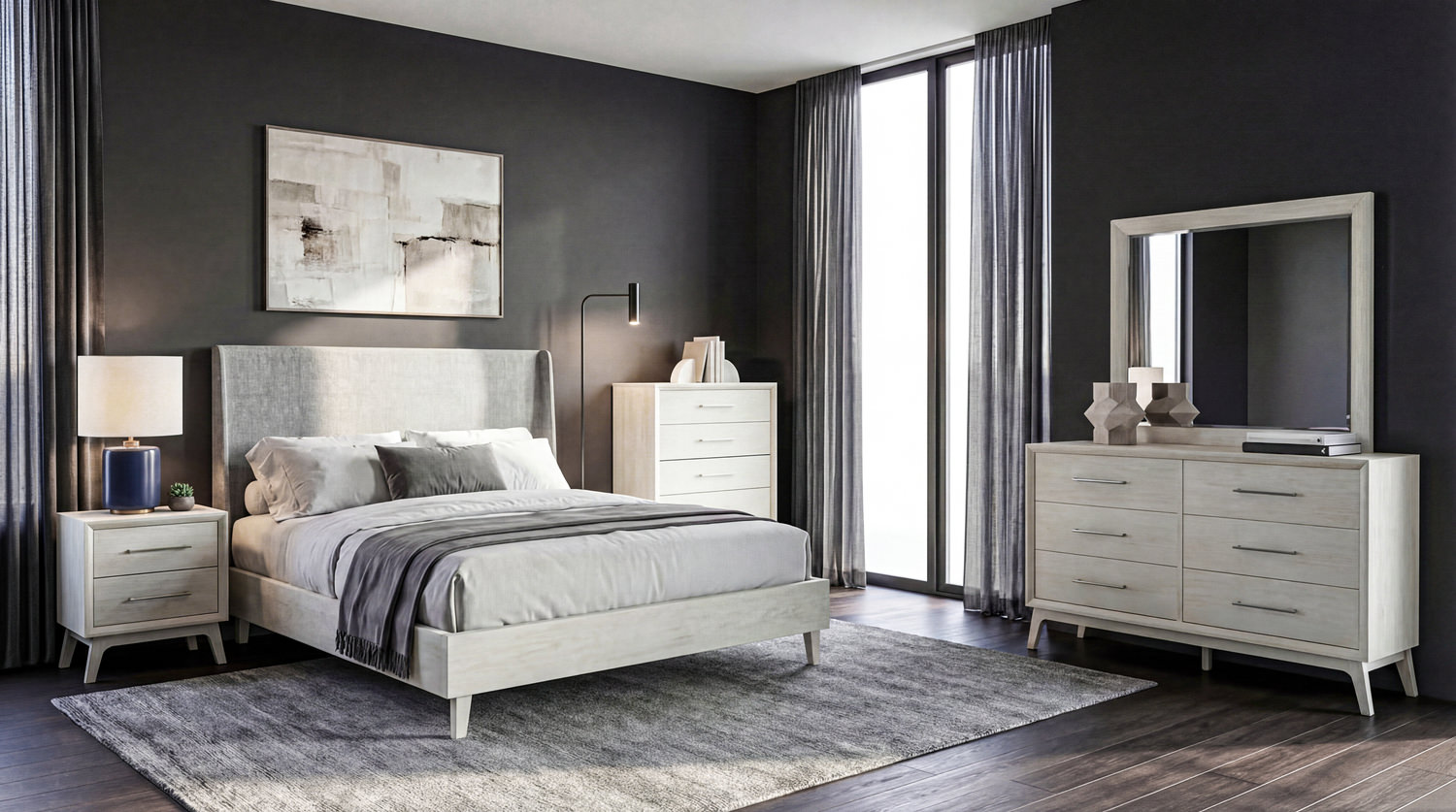 The Rosalind Bedroom Suite is where style meets functionality! This modern and elegant bedroom set features exquisite wood grain detail and turned legs that add a touch of sophistication to your space. The ball bearing drawer glides ensure smooth and quiet operation, making organization a breeze. The easy-to-clean fabric headboard offers both comfort and convenience, while the light finish in a crisp neutral color brightens up any room. Crafted with high-quality engineered wood, this upholstered bed exudes durability and timeless charm. Elevate your bedroom with the Rosalind Bedroom Suite and experience luxury like never before! The suite includes a bed, dresser, dresser mirror, and nightstand.