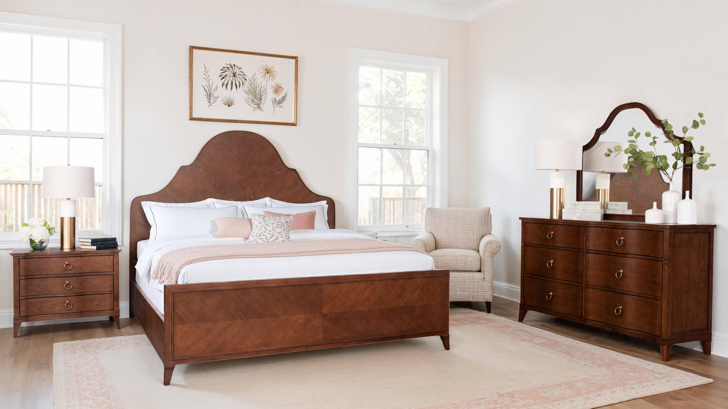 Experience the epitome of luxury and sophistication with the Sage Valley Arched Bedroom Suite. Crafted from solid ash wood with exquisite veneers, all the wood is meticulously kiln-dried to ensure durability and prevent splits, promising a lifetime of beauty and functionality. The cedar-lined bottom drawer offers a touch of elegance and practicality, while the soft-close drawer glides provide a whisper-quiet closing experience. The felt-lined top drawer adds a plush feel to your storage needs. Embrace the timeless charm of traditional style with the curving headboard that exudes warmth and elegance.
