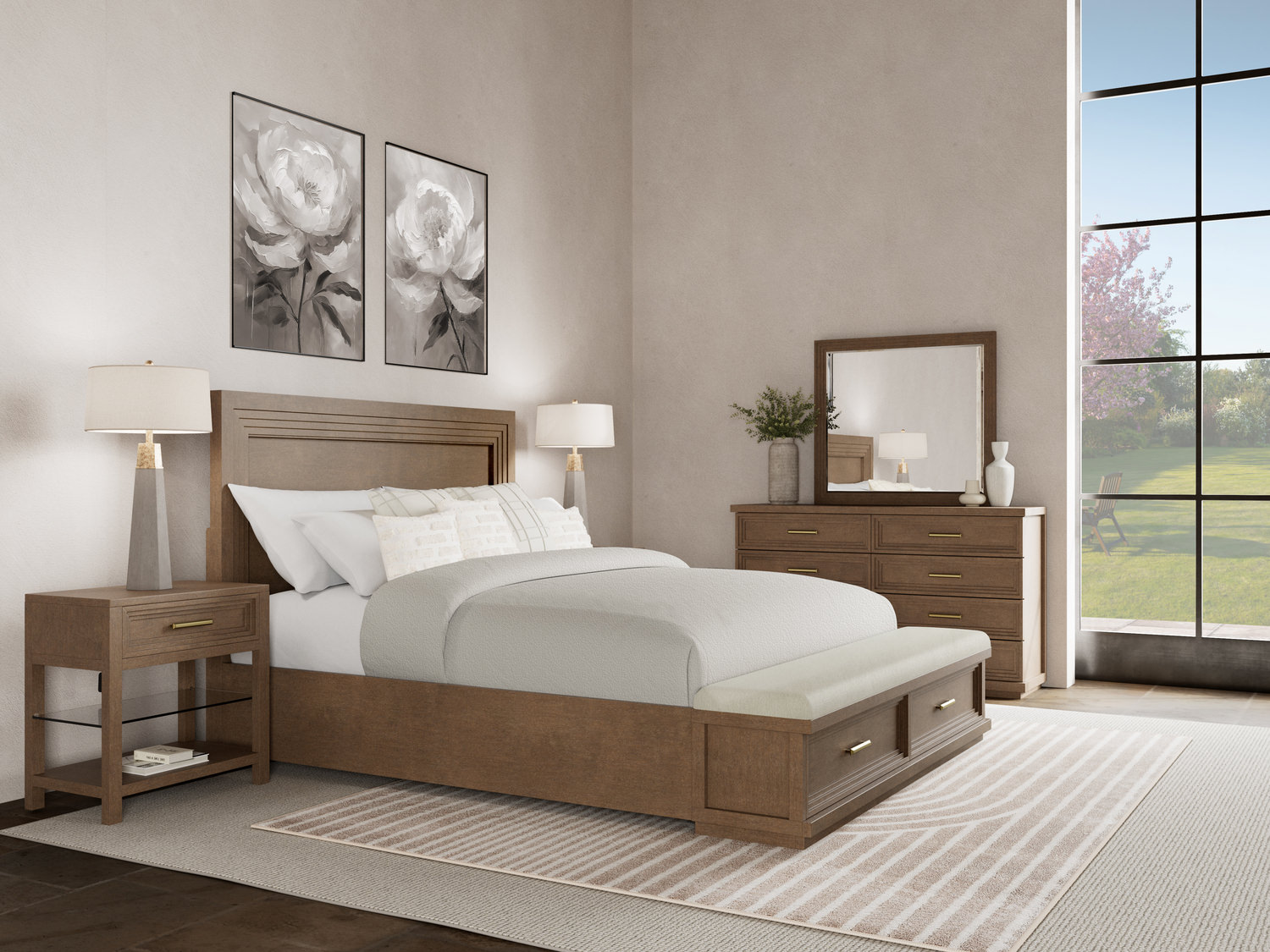 Introducing the Sky Parlor Queen Storage Bedroom Suite from HOM Furniture! This modern and stylish suite includes a bed, dresser, mirror, and nightstand, providing everything you need to complete your bedroom decor. Crafted with hardwood solids and quartered oak veneer, this suite offers durability and elegance. The bed features two storage drawers, perfect for keeping your space organized. With a 750-pound weight capacity, this suite is sturdy and reliable. The brown color and medium finish add a touch of warmth to your room. Best of all, the box spring is not required, making assembly a breeze.