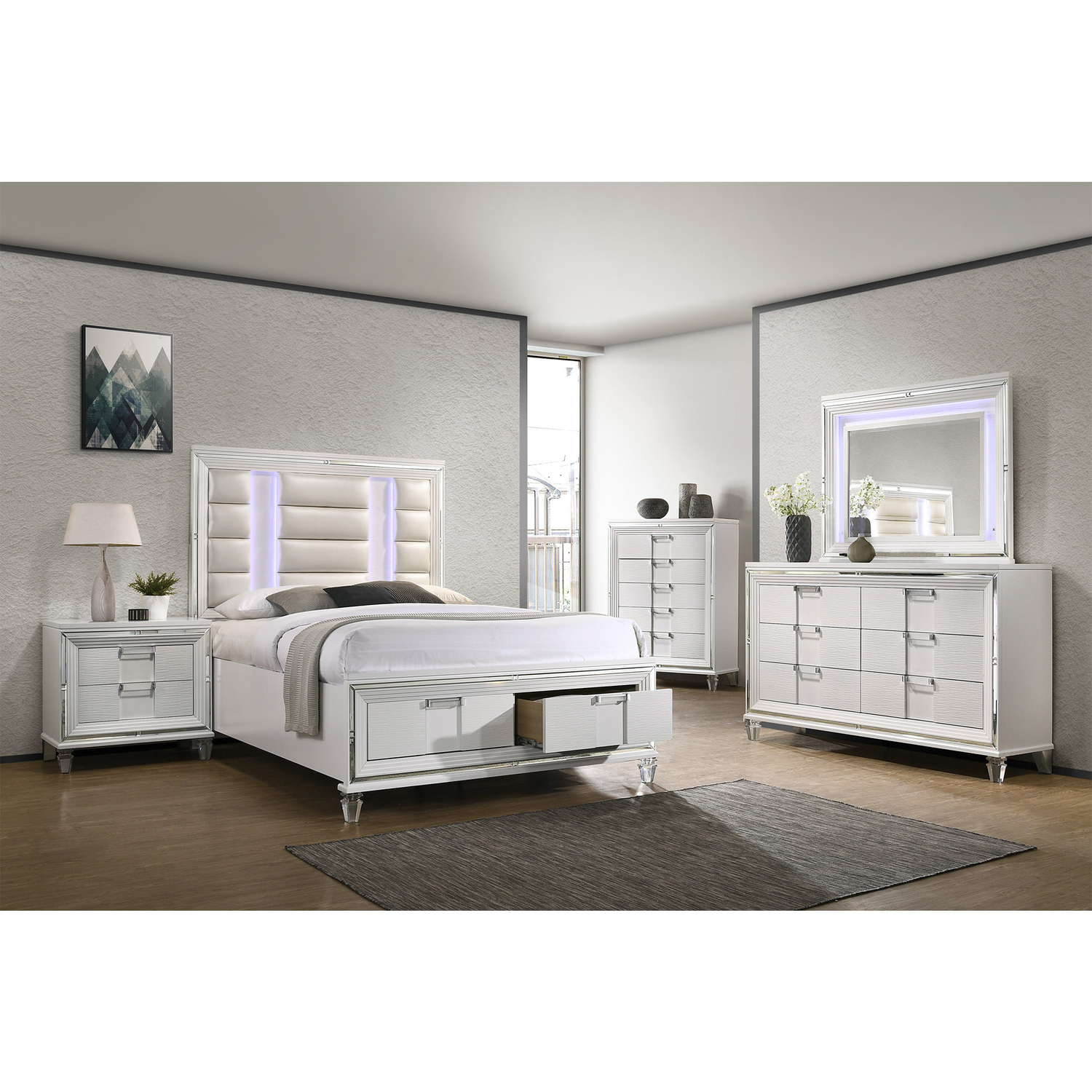 Introducing the elegant Sparkle Bedroom Suite which showcases a stunning white finish complemented by acrylic hardware and feet. Distinguished by its paneled tufting, textured panel detailing, and mirror trim, this collection stands out from the rest. Boasting a sophisticated lighting element, both the headboard and mirror exude a chic allure. The faux leather upholstered headboard adds a touch of luxury to complete the ensemble. Additionally, the footboard features handy storage drawers to enhance organization within your space. The suite includes a bed, dresser, mirror, and nightstand. Chest sold separately.
