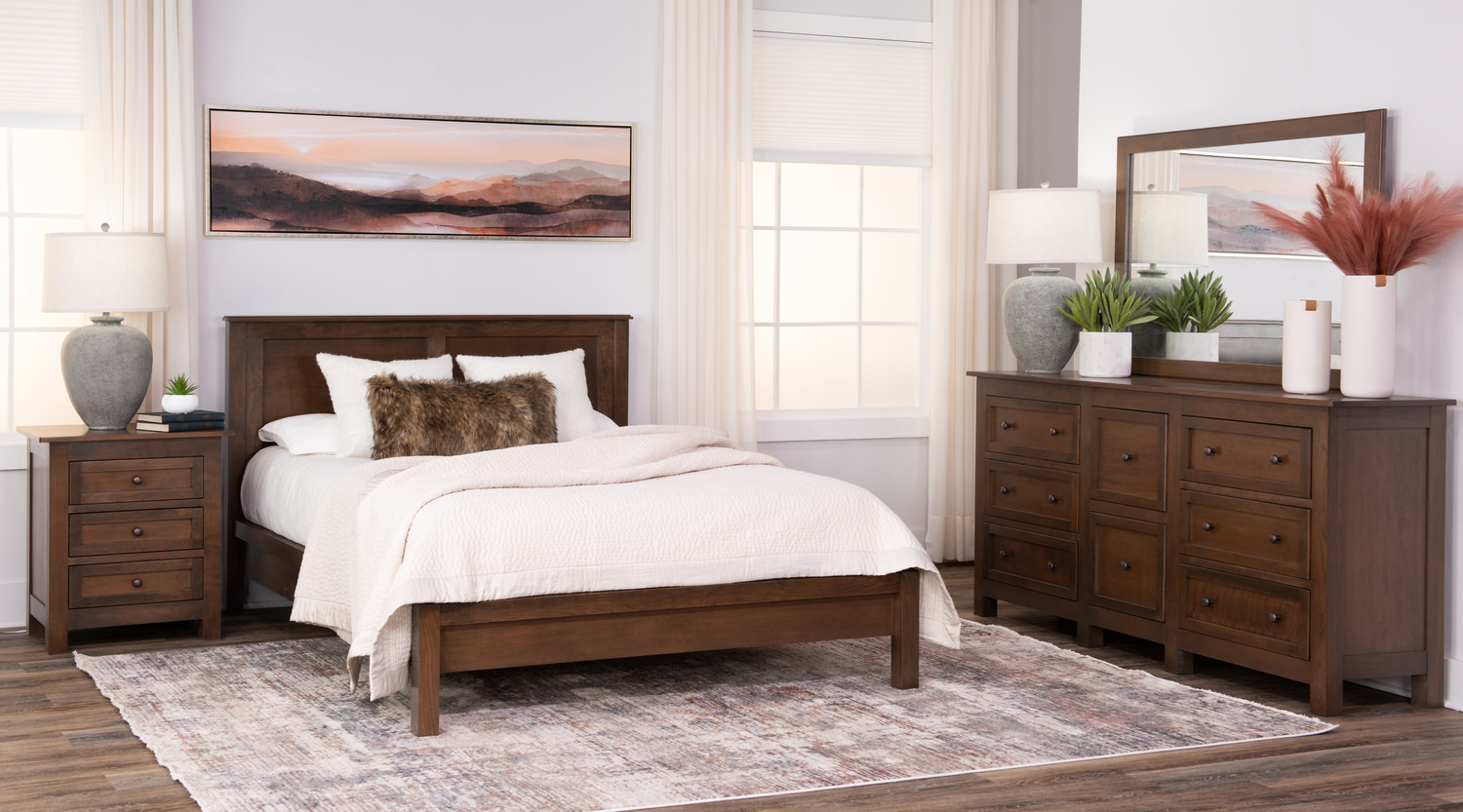 This time-tested Taylor J Platform Bedroom Suite with 3 Drawer Nightstand, classic style with clean, simple contemporary lines, creates a sophisticated and peaceful vibe. This platform bed is designed to support a mattress only. All drawers throughout the collection are constructed using English dovetail drawer joinery and operate on dependable drawer glides that are easy to use throughout the years. The beautiful finish is protected with a 10-step catalyzed lacquer finish to resist heat, water, scratching, and damaging UV light. The bedroom suite includes a bed, dresser, mirror, and 3-drawer nightstand. This beautifully crafted piece is made in the USA. Special order options are available. You may select from several wood species and finish options. Box spring not required.