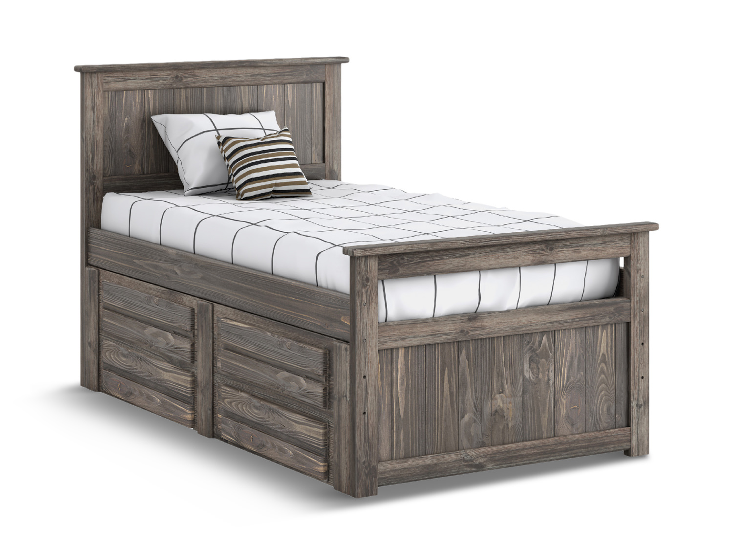 Introducing the Bunkhouse B2 Full Panel Bed With 4 Drawer Underdresser - a delightful addition to any bedroom space! Crafted with care in the USA from solid pine wood, this charming bed has a 200 lb weight capacity, ensuring durability and strength for a restful night's sleep. The urban-inspired design of this bed combines functionality and style, offering 4 underdresser drawers for convenient storage solutions. The rustic finish adds a modern touch to the piece, making it a versatile choice for various décor styles, including casual, transitional, and farmhouse. Dresser, chest, and nightstand sold separately.