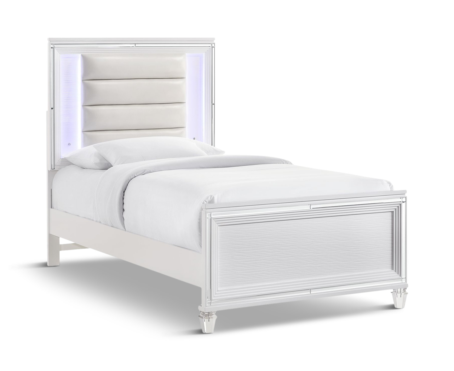 Introducing the elegant Sparkle And Shine Bed, showcasing a pristine white polish complemented by acrylic accents and base. Standout elements include intricate tufted panels, textured detailing, and a headboard upholstered in faux leather with touch lighting.