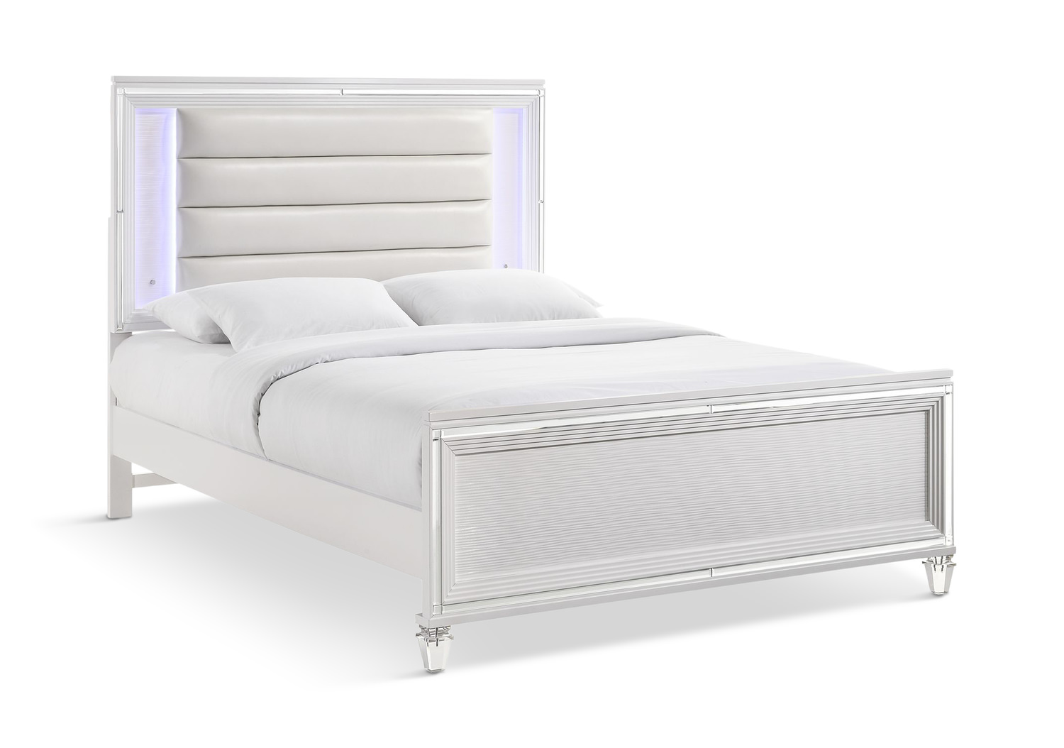 Introducing the elegant Sparkle And Shine Bed, showcasing a pristine white polish complemented by acrylic accents and base. Standout elements include intricate tufted panels, textured detailing, and a headboard upholstered in faux leather with touch lighting.